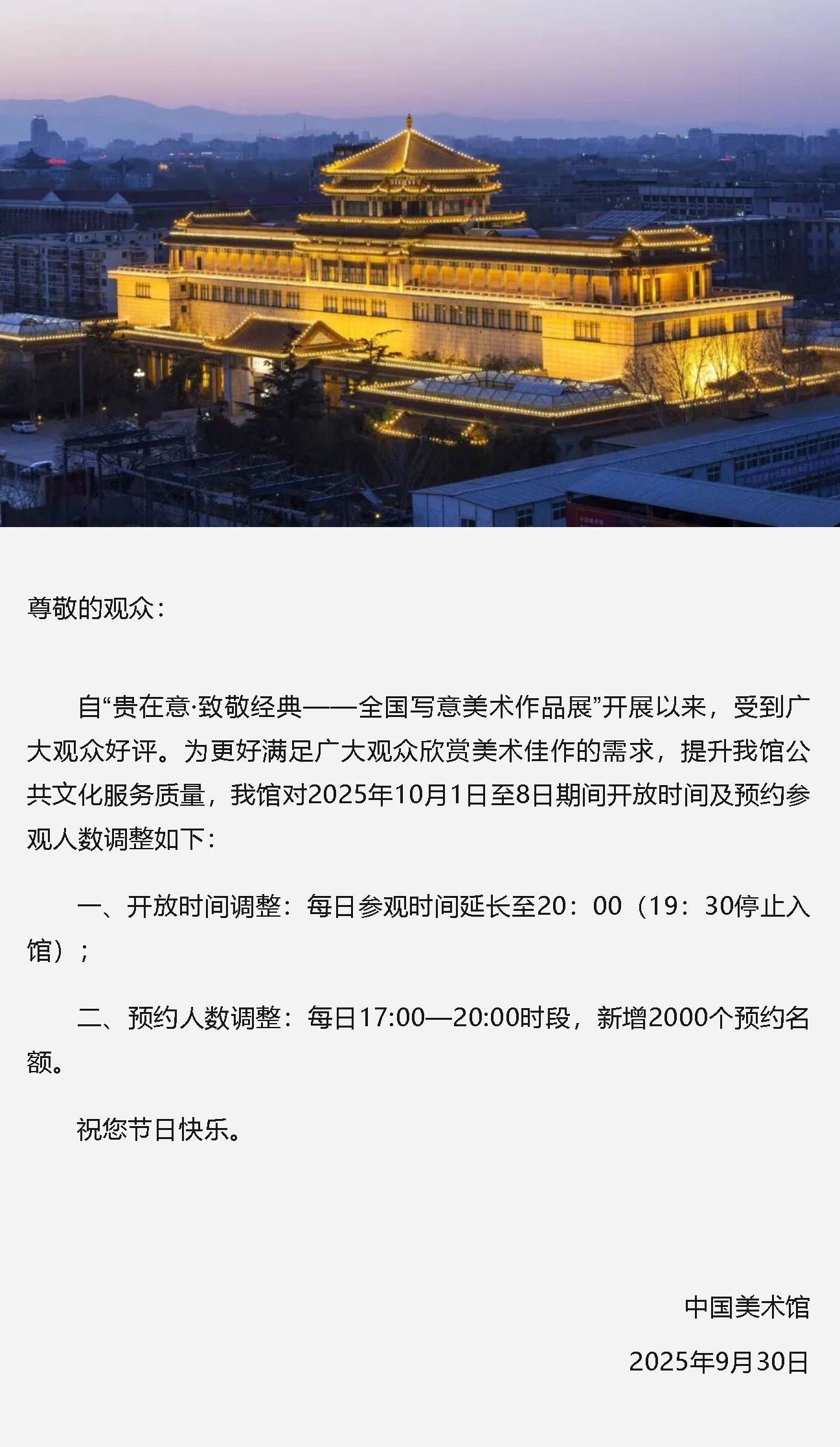 中國美術館關于國慶中秋假期增加夜場參觀的公告