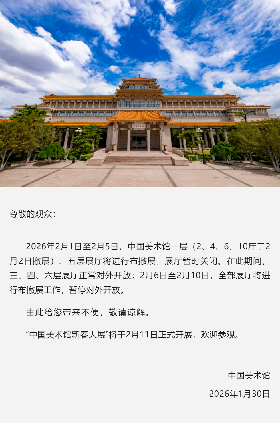 中國(guó)美術(shù)館部分展廳閉廳及新春大展公告