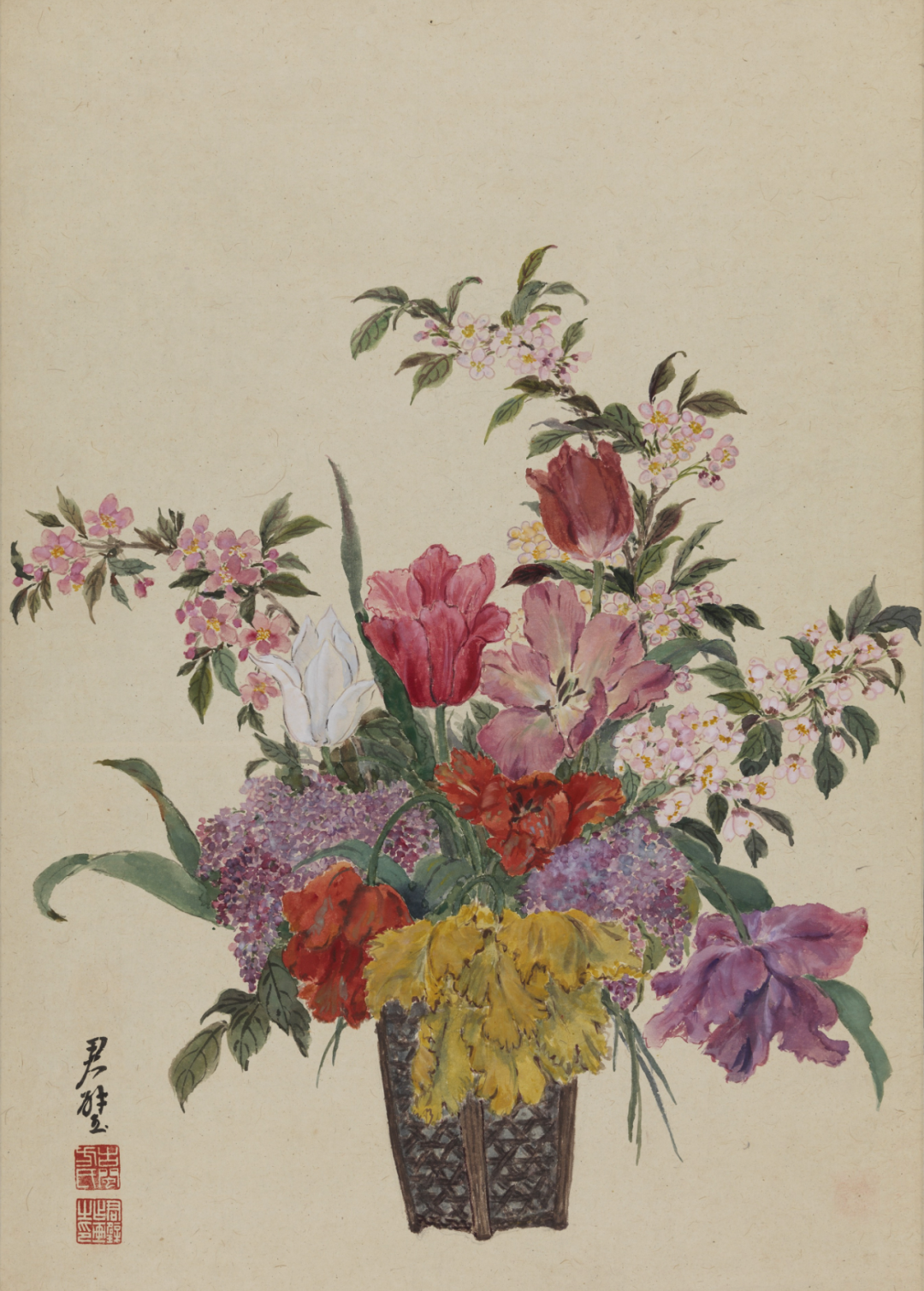 《滿筐春》這件作品充分體現(xiàn)了方君璧的藝術(shù)思想。作品表現(xiàn)的是花與籃的意象組合,這種組合形式在中國(guó)傳統(tǒng)繪畫中常歸于折枝花卉大類,是中國(guó)古代繪畫中的常見題材。據(jù)載,南唐時(shí)李煜就曾用竹筒、竹籃插擺花枝,借以標(biāo)榜其不俗的審美趣味。就圖像實(shí)證而言,已知最早表現(xiàn)花、籃組合的作品是南宋畫家李嵩的《花籃圖》,現(xiàn)有三件存世。之后,元代畫家錢選也畫有多件《花籃圖》。自此,花、籃組合成為中國(guó)傳統(tǒng)繪畫的常見題材。或許,當(dāng)時(shí)身居海外的方君璧就是看到那些古代花籃組合的經(jīng)典圖式而萌生《滿筐春》創(chuàng)作念頭的,以此寄托她對(duì)傳統(tǒng)文化的眷戀之情與回歸之心。在方君璧的創(chuàng)作積累中,與《滿筐春》類似的作品還有很多。插花,成為方君璧繪畫藝術(shù)的意象符號(hào)。