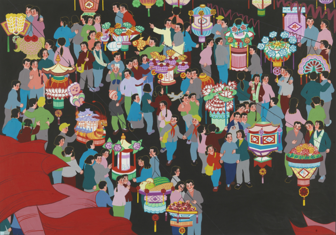 《元宵之夜》描繪了人們在元宵節(jié)夜晚游覽賞燈的場景。畫面尺幅不大,僅有0.6平方米。但在這有限的幅面上,作者描繪了80多個人物、20多盞彩燈,形成密不透風(fēng)的畫面布局,恰當表現(xiàn)出歡樂祥和、共度佳節(jié)的氣氛。這件農(nóng)民畫作品,人物造型明顯受到傳統(tǒng)工筆仕女人物畫的影響。尤其是在面部塑造時,作者巧妙采用傳統(tǒng)工筆仕女人物畫的開臉方法,表現(xiàn)了人們興高采烈的內(nèi)心活動。與傳統(tǒng)工筆仕女畫相比,這件農(nóng)民畫作品在人物造型上進行了大膽創(chuàng)新,一掃傳統(tǒng)仕女畫人物造型的孱弱精巧之風(fēng),準確表現(xiàn)出勞動人民的健康大方。畫作以紅、黃、藍為色彩主體,巧妙使用補色的對比關(guān)系,形成視覺語言的張力,取得熱烈而不艷俗的藝術(shù)效果。