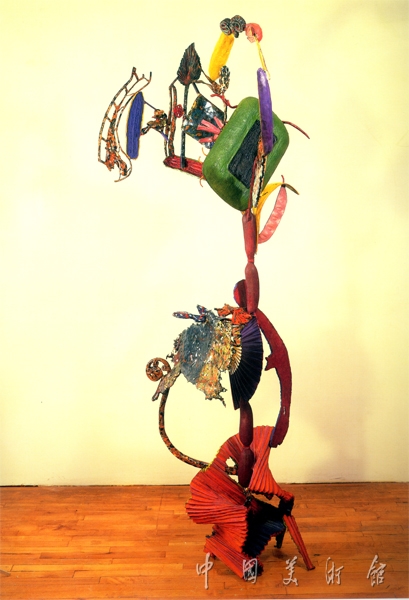 該裝置藝術(shù)的腳部是具有折疊紙板質(zhì)感的形體,它似乎是岌岌可危地支撐著由一串香腸狀(或者是茄狀)物體組成的主莖,上面裝飾有一把中國式的折扇、幾只蝶狀的昆蟲。裝置藝術(shù)品的上方傾斜地放置著一只綠色托盤,托盤四周散亂地連接著漂浮在空中的紙巾、葉子、果蔬等物品。
