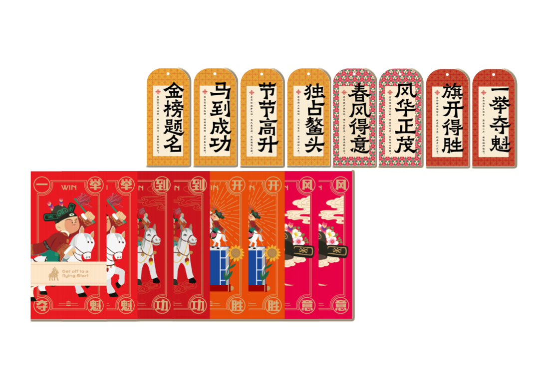 守歲禮俗,福滿乾坤,一套別具風(fēng)格的紅包對(duì)聯(lián),是對(duì)新歲的期許?!捌扉_(kāi)得勝”系列紅包、對(duì)聯(lián),將美好寓意融入新春祝福,每一枚紅包中都包含一張祝福簽。