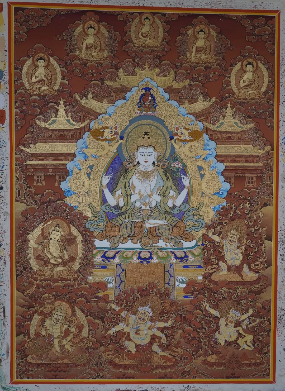 紅唐帶彩四臂觀音 娘本 唐卡