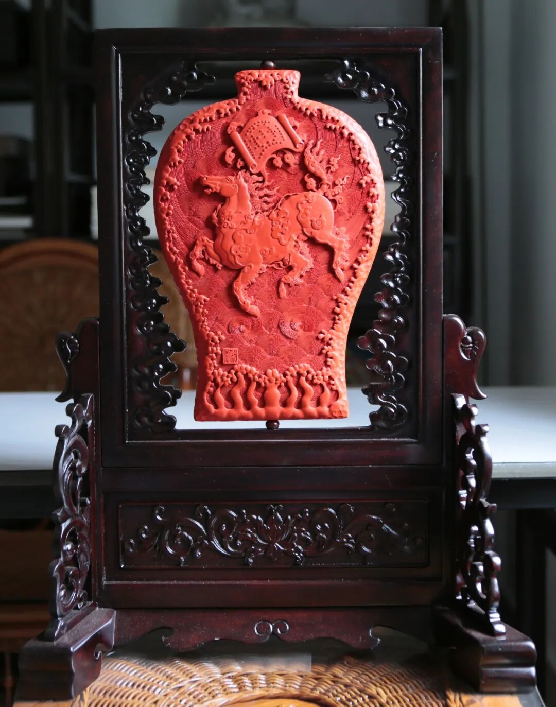 剔紅龍馬獻(xiàn)圖插屏 文乾剛 漆藝