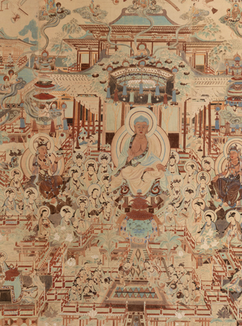 《觀無量壽經(jīng)變》是常沙娜在1946年臨摹自敦煌莫高窟盛唐第172窟的作品。作品分三段而成,完整地描摹了敦煌洞窟中盛大的經(jīng)變場景。在三米高的作品中,主尊位于畫面中心,面含笑意、神態(tài)安然;其他各佛、菩薩分坐兩側(cè),體態(tài)端莊優(yōu)美;宏偉壯觀的樓臺亭閣聳立在碧波蕩漾的七寶蓮池中,寶池中蓮花盛開,蓮花童子嬉戲追逐于蓮荷之間;舞臺上伎樂隨著音樂的旋律翩翩起舞,飄蕩在空中的樂器不鼓自鳴,間有飛天穿游于樓閣廊宇之間。一派極樂世界的美妙景象。畫面中百余人物栩栩如生,建筑結(jié)構(gòu)層疊工整,聽法場景氣氛肅穆,內(nèi)容繁多而不顯畫幅淤塞,各細節(jié)刻畫細致入微,神態(tài)、動作、衣飾無一不被完整臨摹下來。作品可謂再次呈現(xiàn)出盛唐時期壁畫中的富貴華麗。難以想象此幅作品是一位少女所為。當時,年僅15歲的常沙娜正熱忱的隨父親以及其他藝術(shù)前輩在莫高窟中臨摹壁畫。如此一件巨幅作品僅用2個月,也就是她一個暑假的時間,就已完成,一筆一劃間透露出她對壁畫的熟悉感與過人的洞察力。由此,常沙娜與莫高窟結(jié)下了不解的情緣,她用超出年齡的成熟、穩(wěn)重與嚴謹,守護著這座千年的藝術(shù)珍寶。